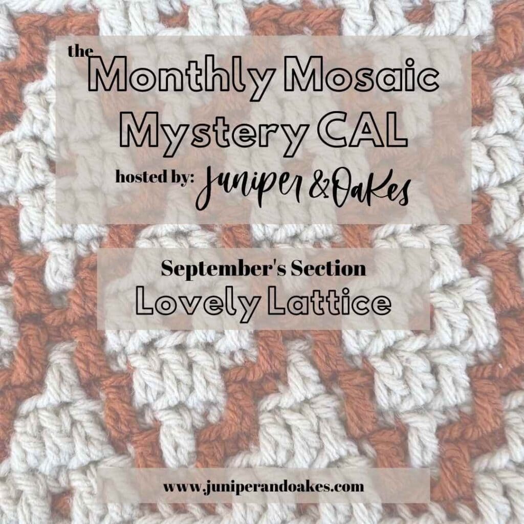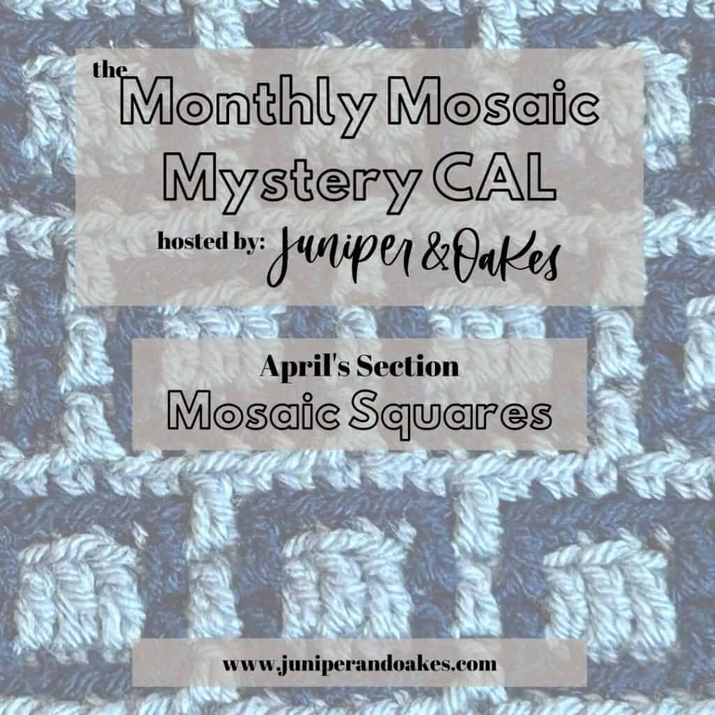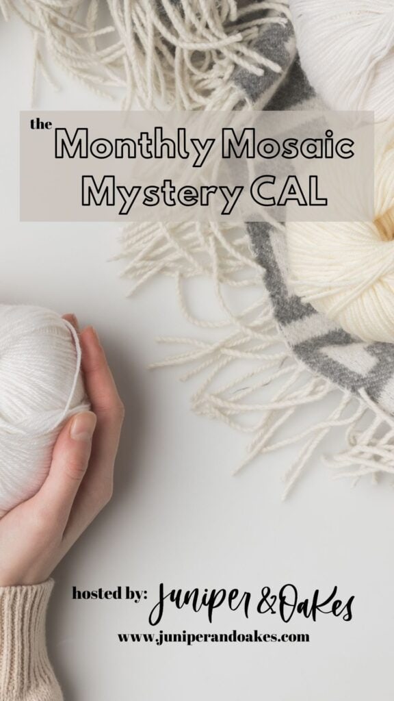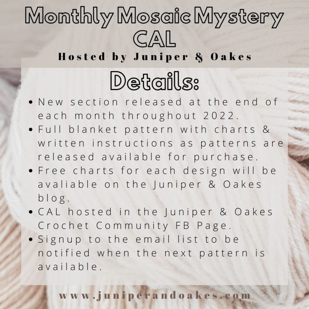 After grabbing each new pattern, make sure you hop on over to the Juniper & Oakes Crochet Community. You can ask questions, post pictures of your WIPs and finished squares, watch live videos, and join our virtual Sip & Stitches. It will be a lot of fun! If you don’t have Facebook, you can still participate in the CAL by creating your blanket on your own. Definitely post pictures and share about the CAL on any social media you have. Be sure to tag me @juniperandoakes and use #monthlymosaicCAL so we can see your progress.