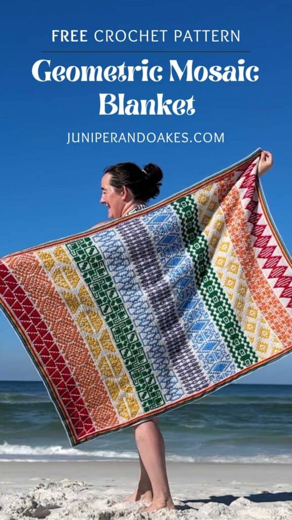 But I’ll give you a quick summary right here. We are all creating an heirloom geometric crochet blanket together over in the Juniper & Oakes Crochet Community FB Group. Each Monday, Wednesday, and Friday during June 2024, a new free blanket section chart will be released on my blog in blog hop fashion, as there are 10 other designers who helped make this blanket!