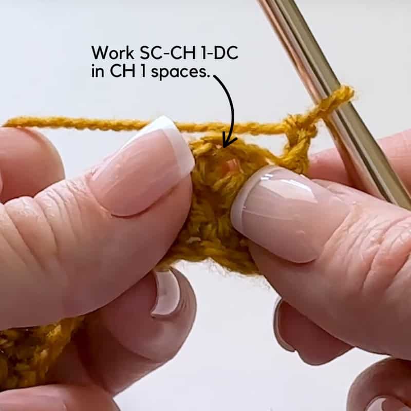 Row 4: CH 2, SK first SC and DC, *(SC, CH1, DC) into next CH SP, SK next SC and DC, rep from * to last CH SP, SK last SC, sc in TCH, turn. (132 sts)