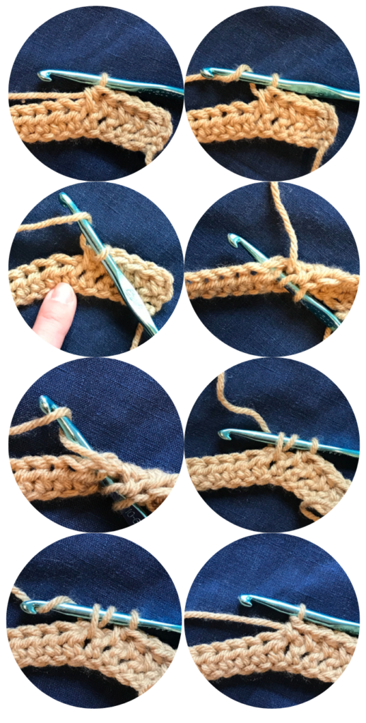 2: Insert hook under all three loops, in between the hdc stitches of the previous row
