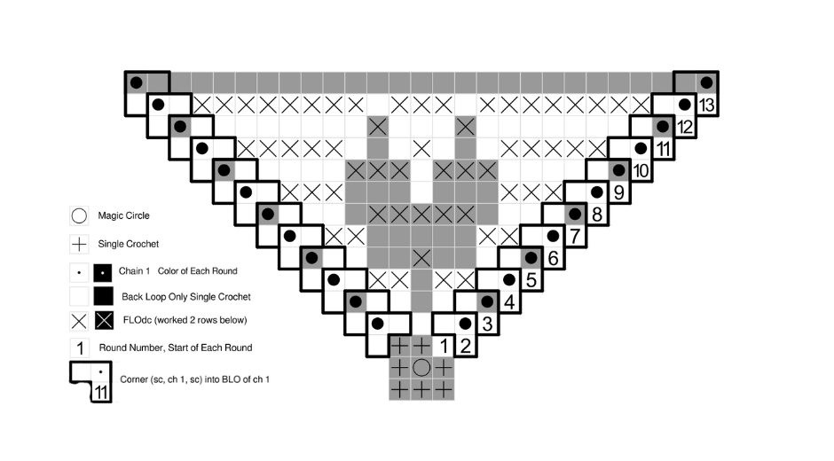 Round 11: With Color A, ch 1, *Corner, BLOsc x7, FLOdc x1, BLOsc x3, FLOdc x1, BLOsc x7,* repeat from * around.