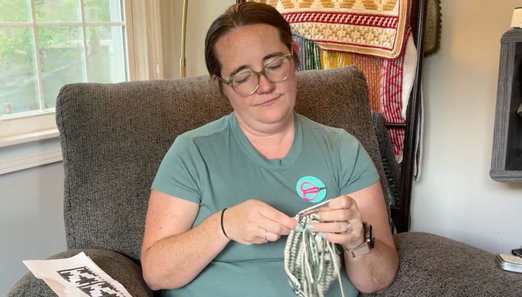 It’s really easy. You don’t have to frog the whole project. You can just frog back to where the mistake is and then fix as you go. This is one of my best time-saving mosaic crochet techniques. It’s magic. When I first realized that, I was like, “Genius!” No extensive frogging needed. I repeat, no frogging needed! Before you start ripping out your whole project, watch this tutorial to see how to fix mosaic crochet mistakes a couple rows down.