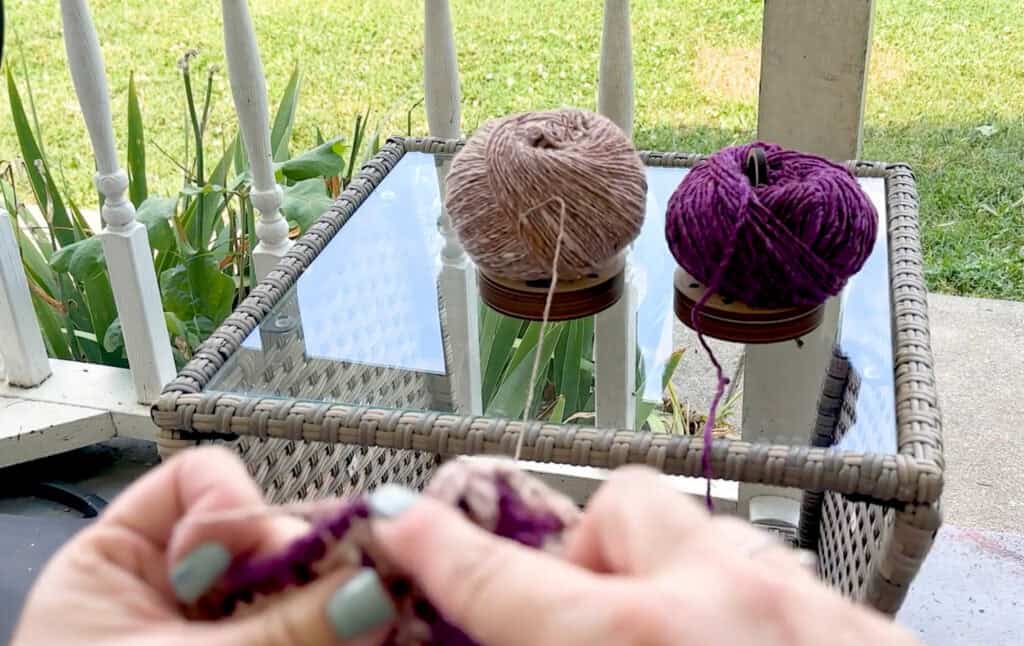 The brand I use, pictured above, is Yarn to Go from Twice Sheared Sheep. They come with these nifty straps so you can walk around with them, one on each arm. I use them on the go all the time. Iโve taken them on road trips. But also helpful when just sitting there on my front porch. So I think they’re great! Grab the Yarn to Go carousel from Twice Sheared Sheep or try this similar one from Amazon.