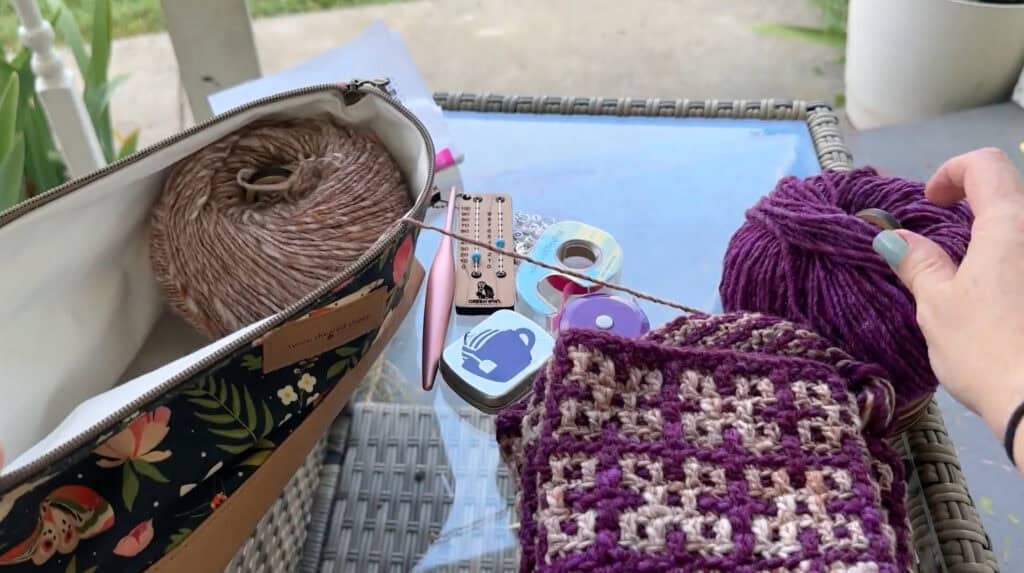 And finally, tip number 10. We all know this one because we’re crocheters, right? Pack up a little project pouch that includes your projectโyour yarn, your hook, maybe your yarn carousels, your stitch markers, scissors, snips, chart, pattern, row counter, whatever you may need. Just pack that all up so that when you’re on the go, you can just be crocheting wherever you are.